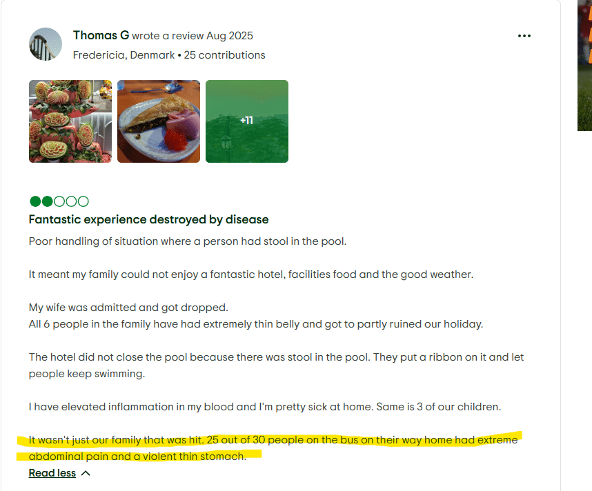 Päivä pari (henkilöstä riippuen) loman alkamisesta matkan todellinen luonne alkoi valjeta. Retkiseurueen aikuisista 6/6 saivat kovan vatsataudin (ripulin). Kolme kuudesta aikuisesta joutuivat hotellin hoitohenkilökunnan passittamana myös sairaalaan tiputushoitoon.